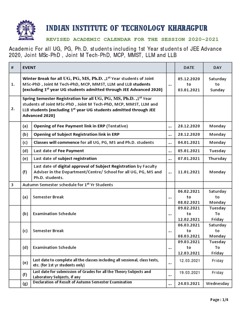 Indian Institute of Technology Kharagpur Revised Academic Calendar For