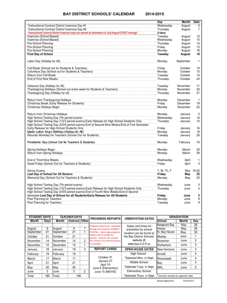 Bay District Schools' Calendar 20142015 PDF Academic Term Public