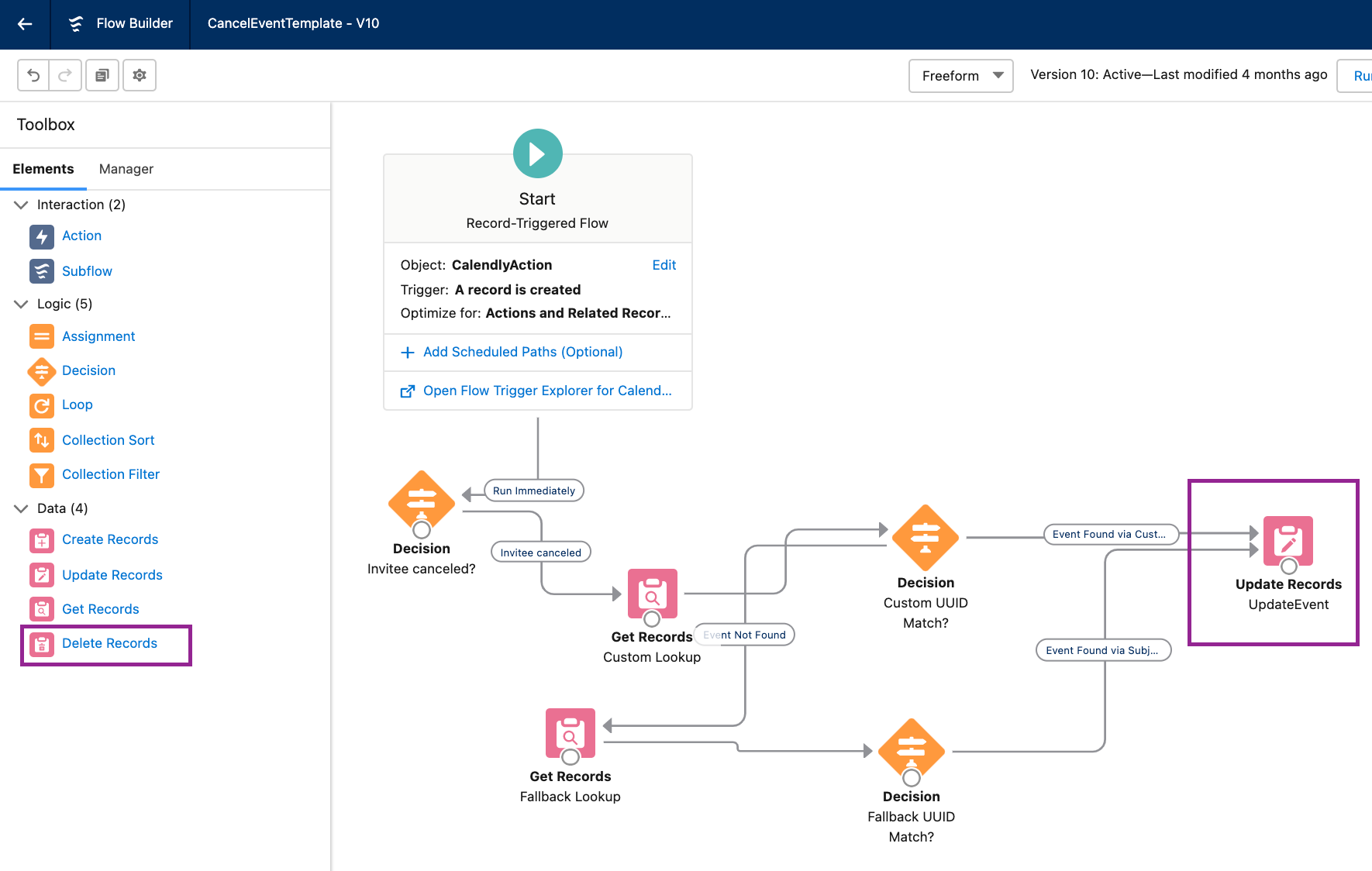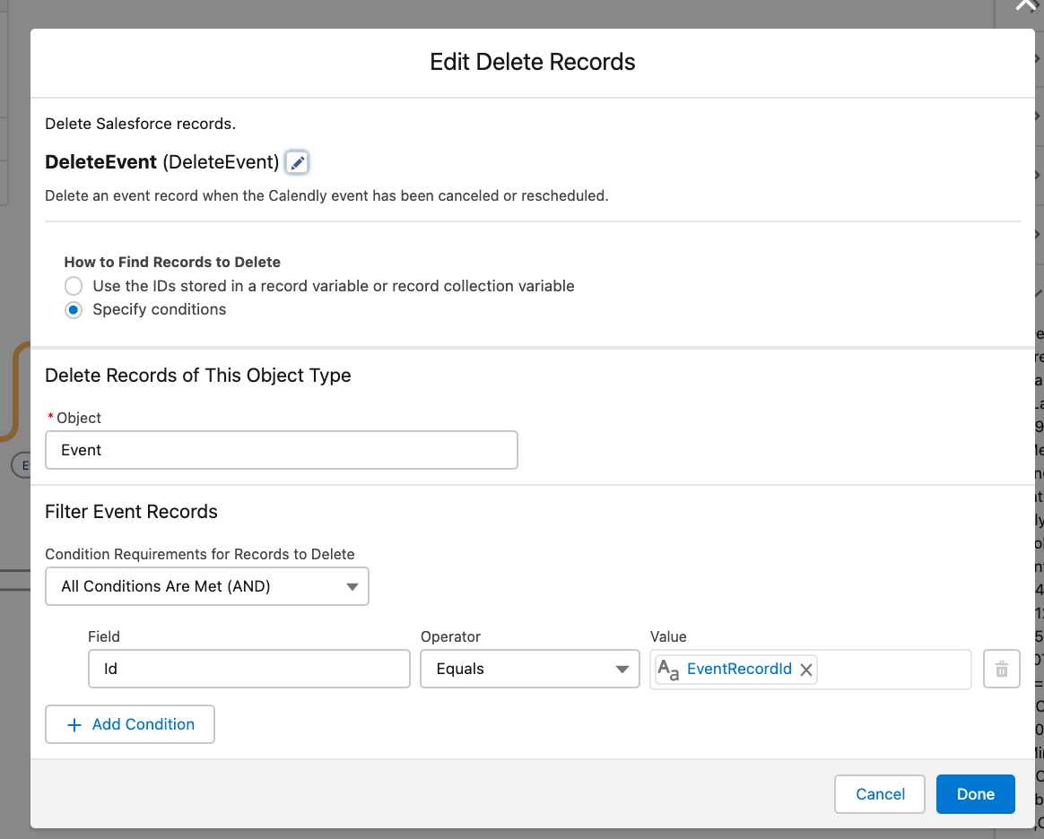 Delete an event record in Salesforce when a Calendly event is canceled
