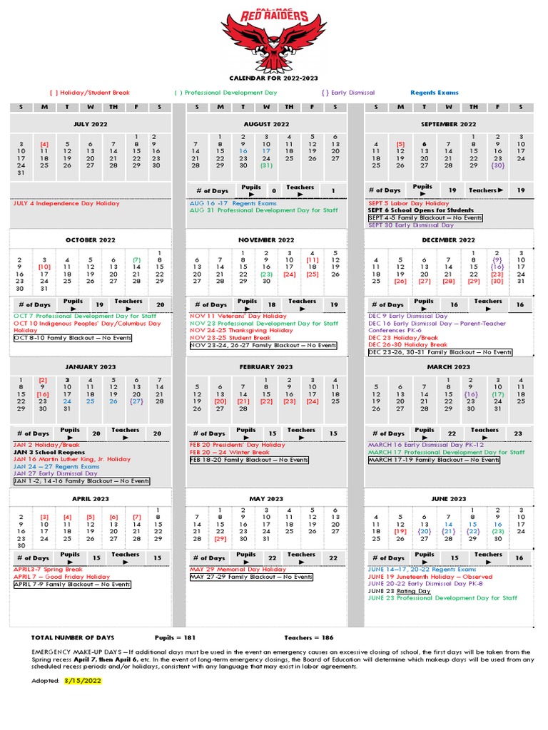 PalmyraMacedon CSD 20222023 School Calendar Printable PDF The