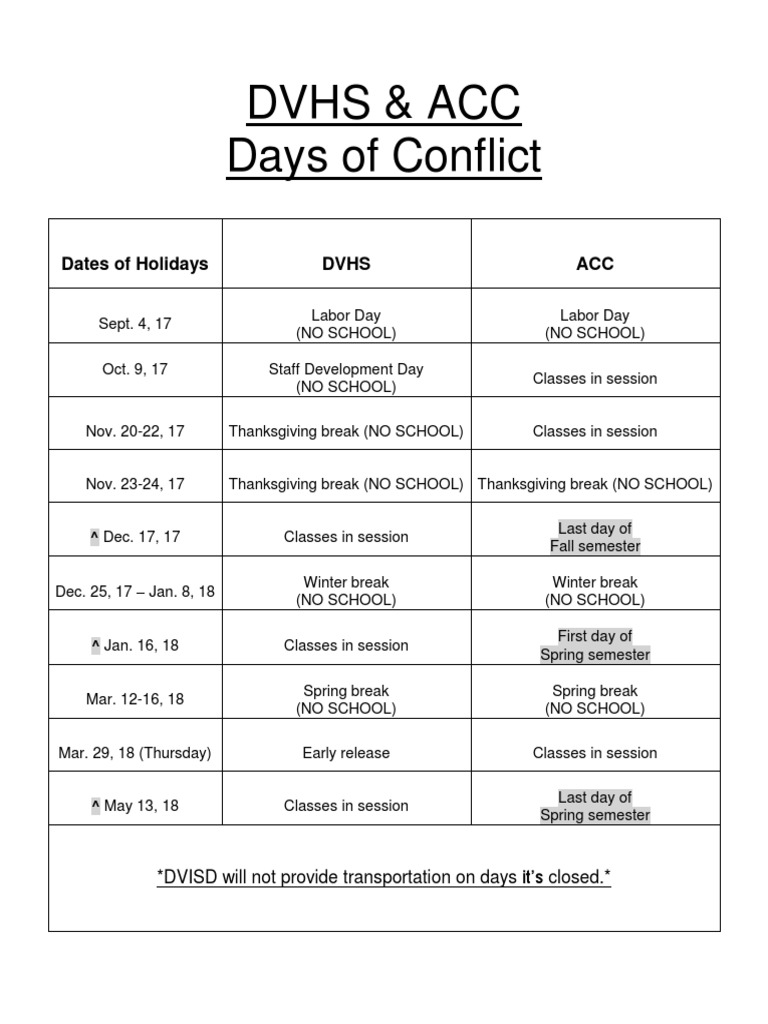 Dates of Holidays 1718 Acc and Dvhs PDF
