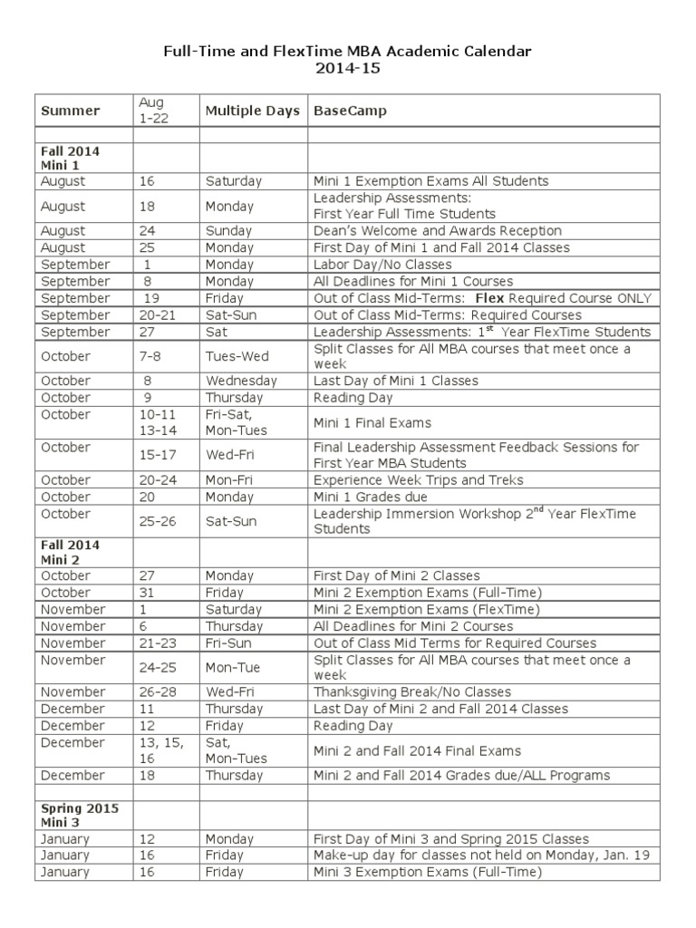 FullTime and Flextime Mba Academic Calendar 201415 Summer Multiple