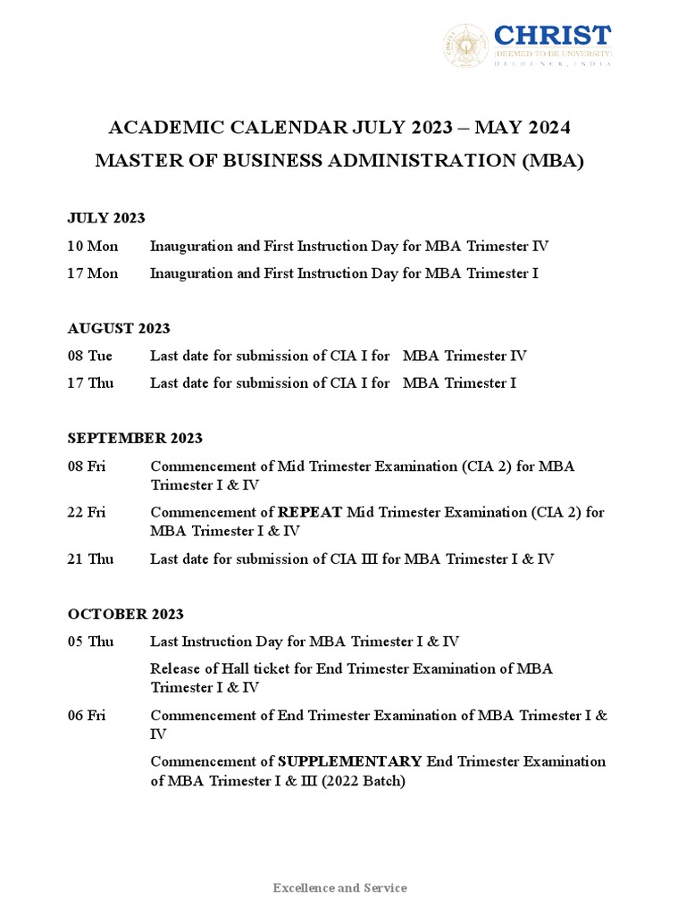 Examination Calendar (MBA) July 2023 PDF Academic Term Schools