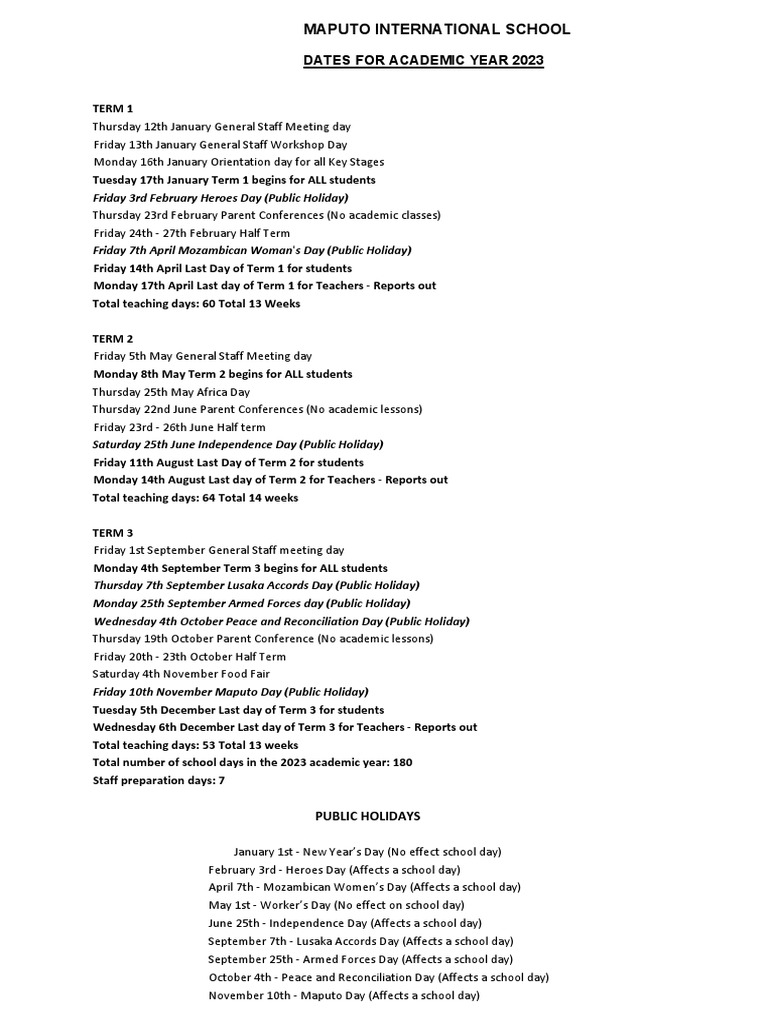 2023 Mis Academic Calendar PDF Academic Term