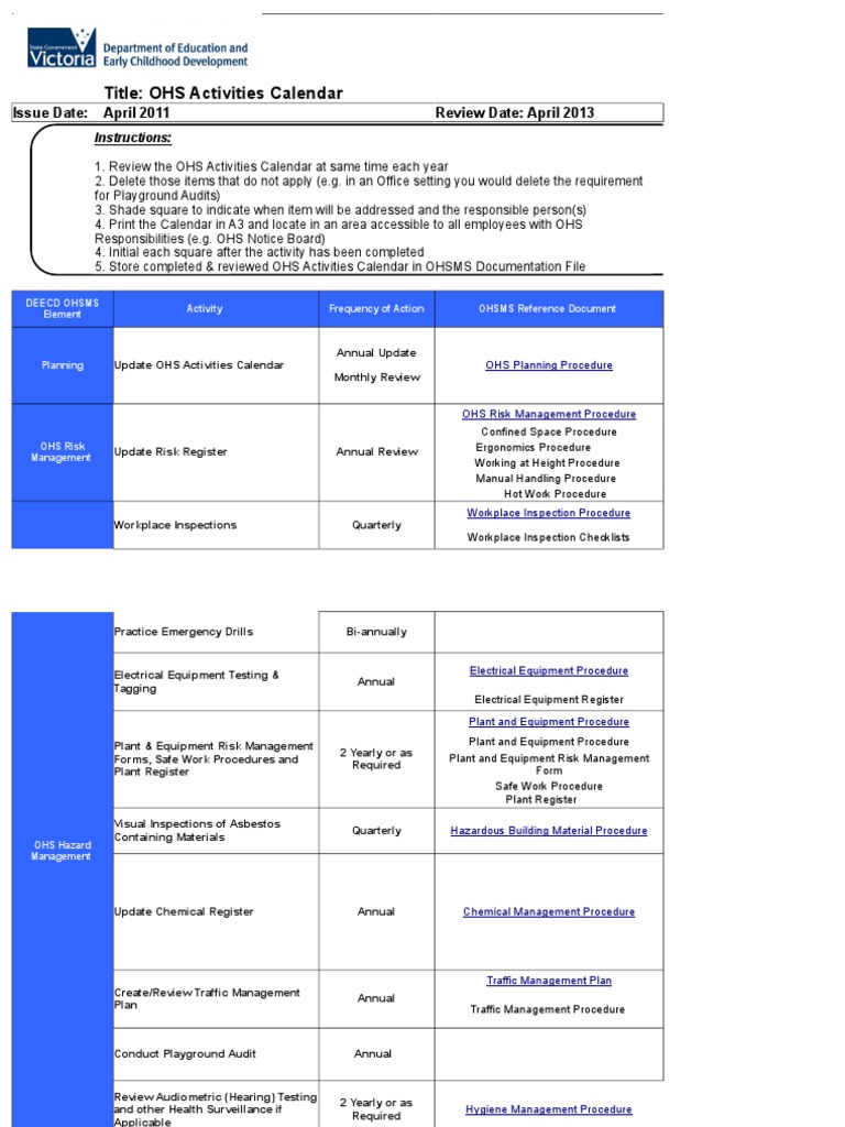 DEE EHU 221 OHS Activities Calendar Occupational Safety And Health