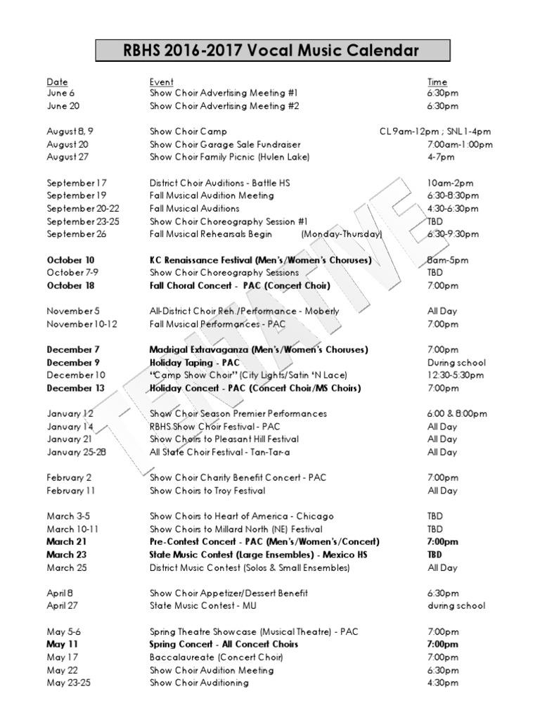 RBHS 20162017 Vocal Music Calendar PDF Choir Music Organizations