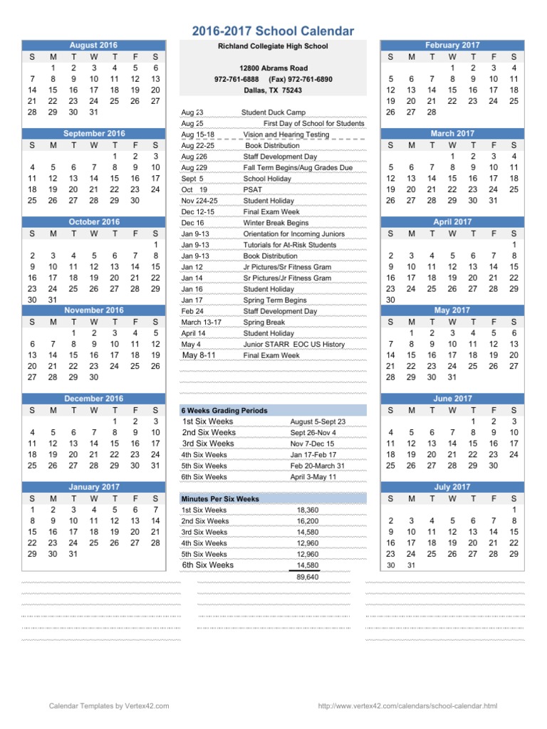 2016 2017 RCHS School Calendar