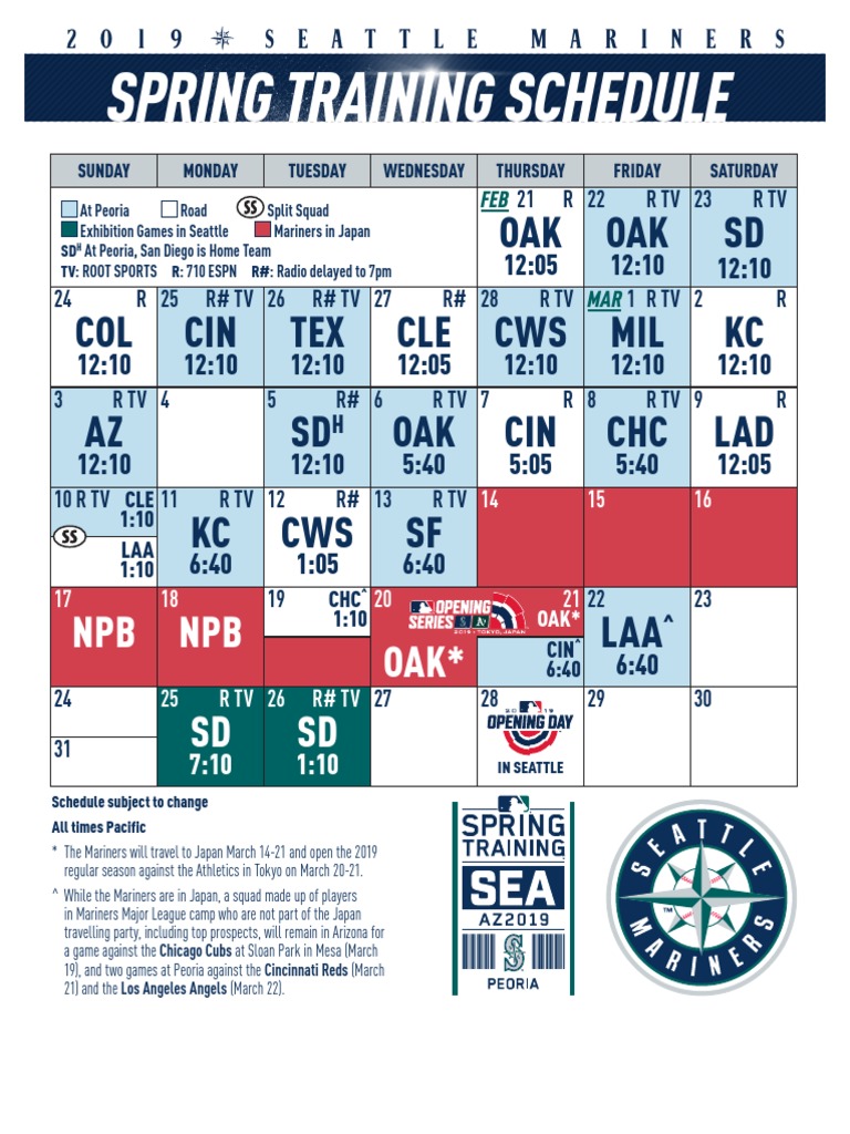 2019 Mariners Spring Training Schedule with TV/Radio info Baseball