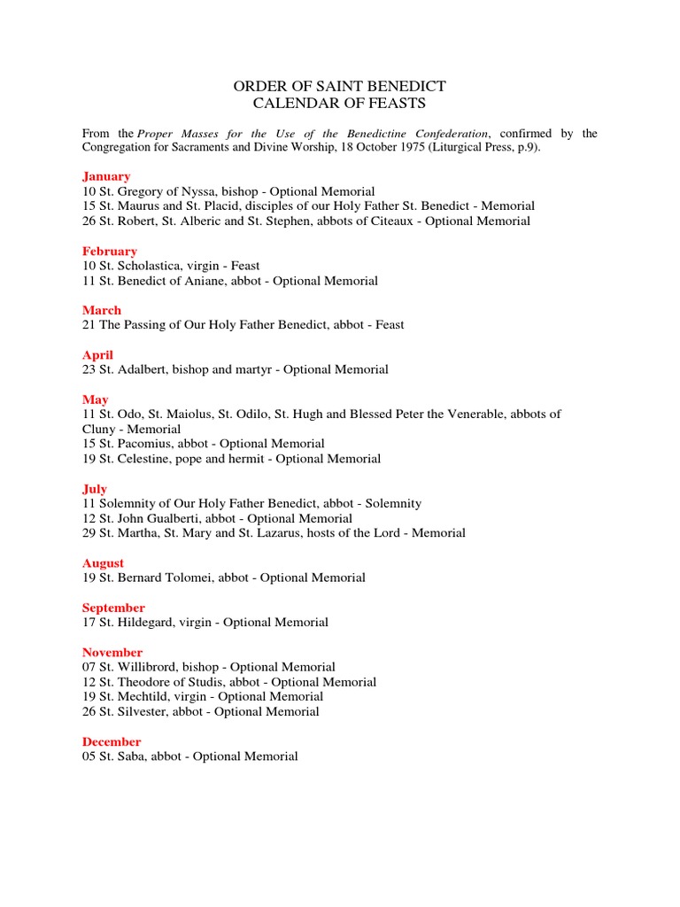 Order of Saint Benedict Calendar of Feasts January PDF